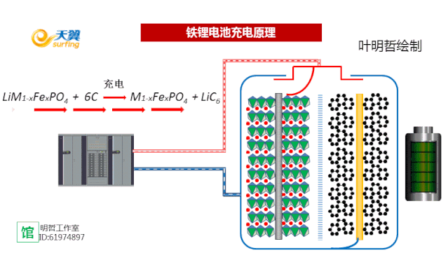 充电时,锂离子在电场力的作用下, 从磷酸铁锂晶体表面,进入电解液,穿过隔膜,再迁移到石墨晶体的表面,然后嵌入石墨晶格中。 锂离子从磷酸铁锂脱嵌后,磷酸铁锂转化成磷酸铁,过程如图2: