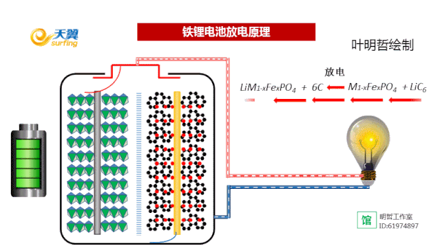 磷酸铁锂电池简称铁锂电池, 采用橄榄石结构的LiFePO4作为电池的正极,由铝箔与电池正极连接,中间是聚合物的隔膜,它把正极与负极隔开, 但锂离子可以通过而电子不能通过,右边是由石墨组成的电池负极,由铜箔与电池的负极连接。
