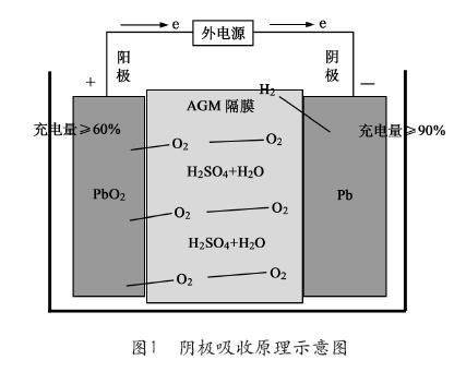 蓄电池在充电过程中,负极反应近似为还原反应,所以负极也称为阴极。蓄电池电池负极活性物质相对于正极有盈余,超细隔板透气性好,能吸附全部电解液,使电解液在蓄电池内部无流动性,同时又有自动开、闭的安全阀,保证了正极产生的氧气,在蓄电池内部以循环的方式被阴极吸收,即称为阴极吸附式原理。阴极吸收原理示意图如图1所示。