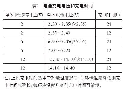 ①密封蓄电池在使用前不需进行初充电,但应进行补充充电。补充充电方式及充电电压应按产品技术说明书规定进行。一般情况下应采取恒压限流充电方式,补充充电电流不得大于0.2C10(C10为电池的额定容量),充电电压和充电时间如表2所示。