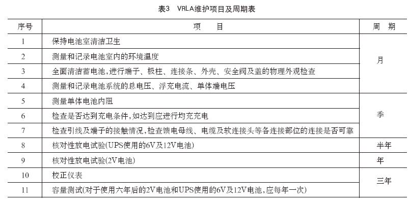 VRLA维护项目及周期表如表3所示。